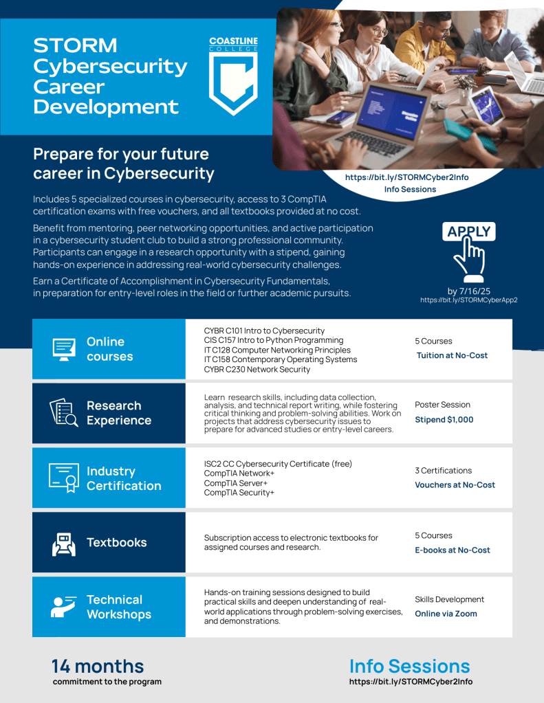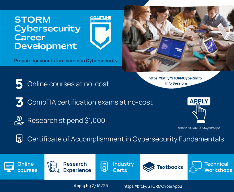 Unlock an exciting future in cybersecurity—STORM Cyber @ Coastline College offers free courses, certification vouchers, and research experience to help prepare for a career in cybersecurity!